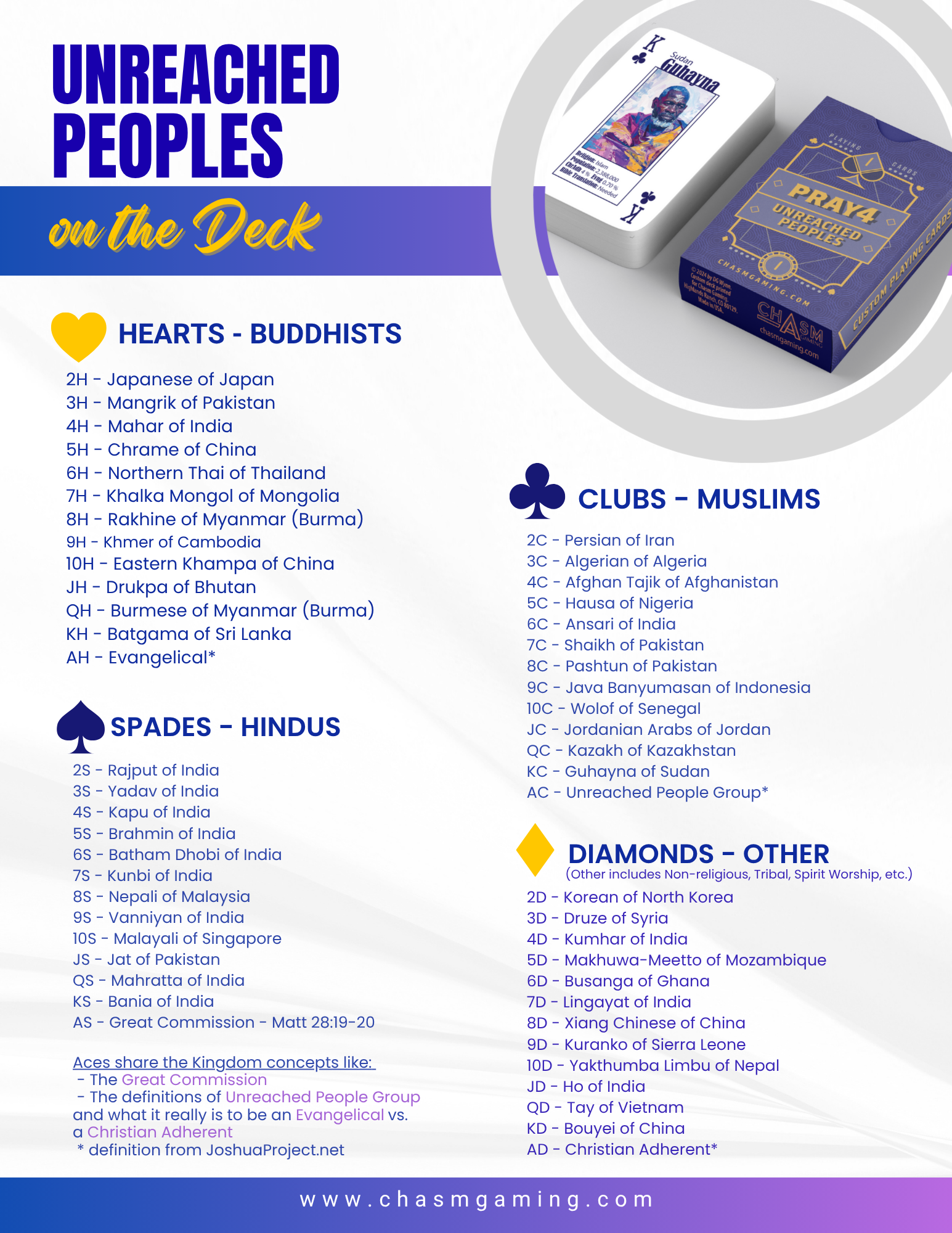 The deck features 48 UPGs, which are Unreached People Groups. These people groups are those who have yet to be introduced to the gospel. Each card will share a few vital details to spark prayer: the people group name, home country, population size, major religion, percent of Jesus followers, and status of Bible translation. Further, each ace defines Kingdom concepts like the Great Commission, what makes someone a UPG, and more.